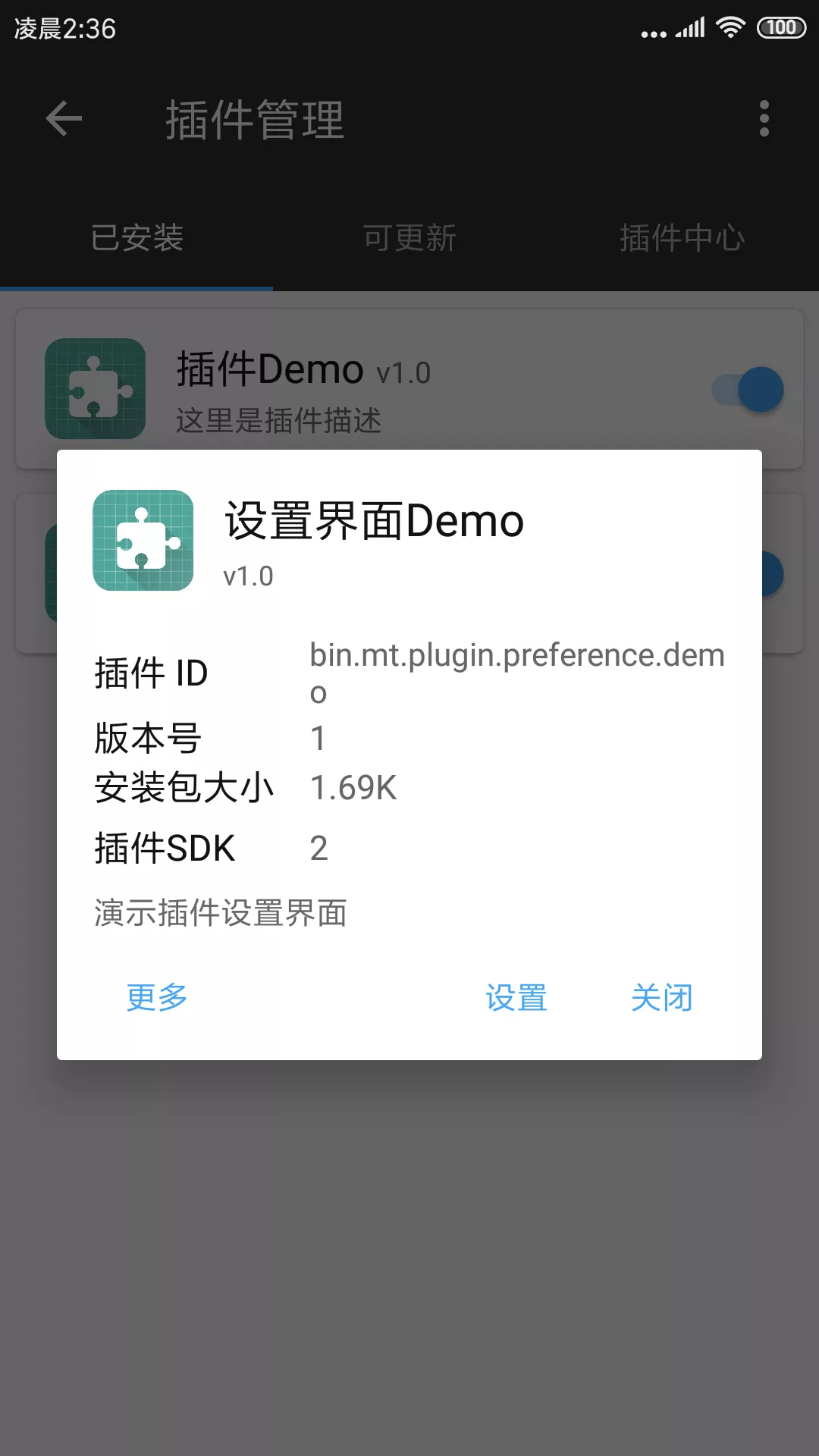 安装完插件后,进入插件管理界面,点击「设置界面Demo」即可看到设置:
